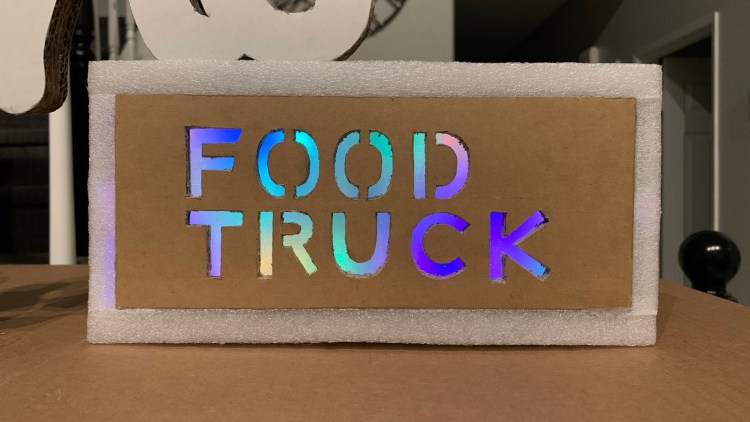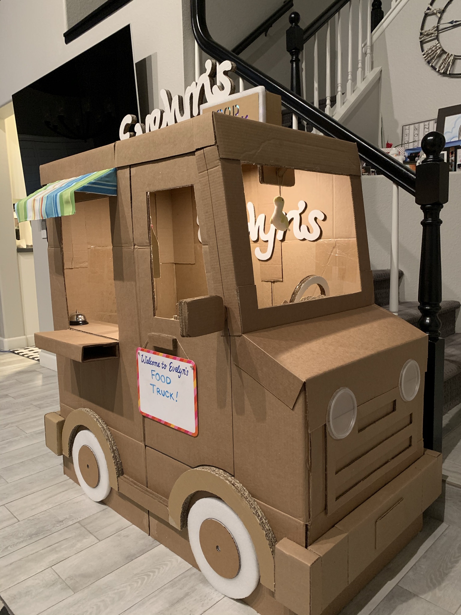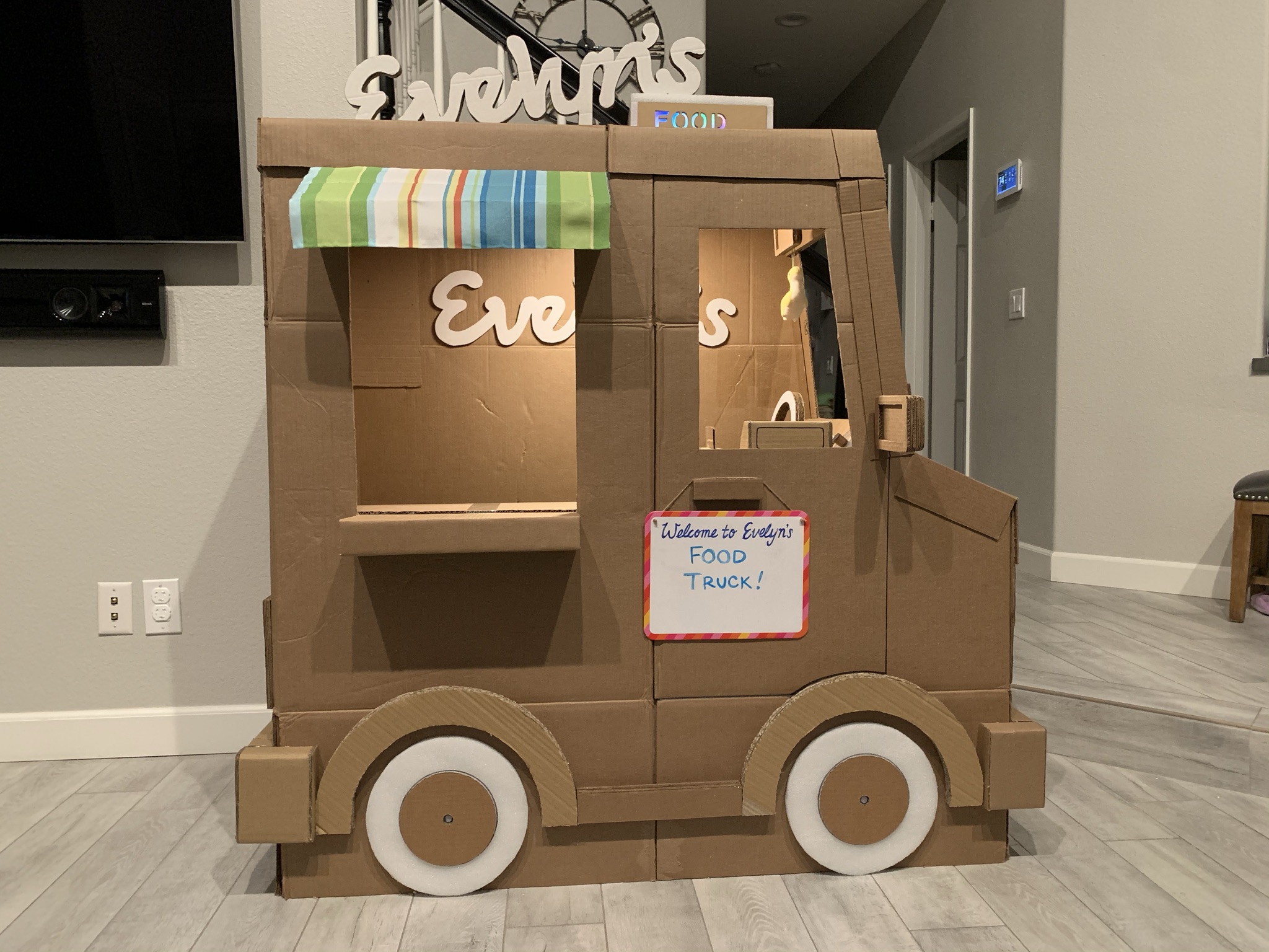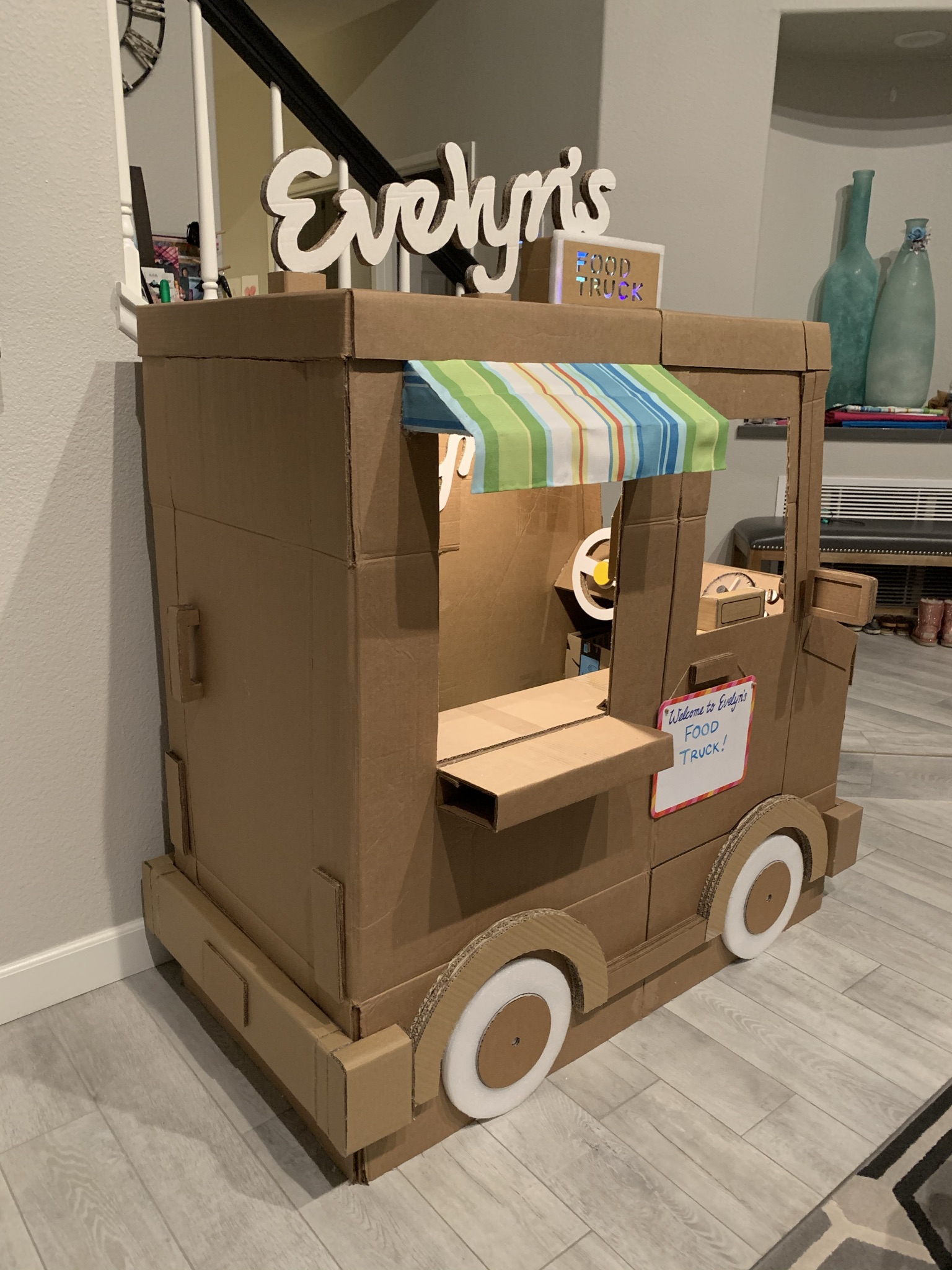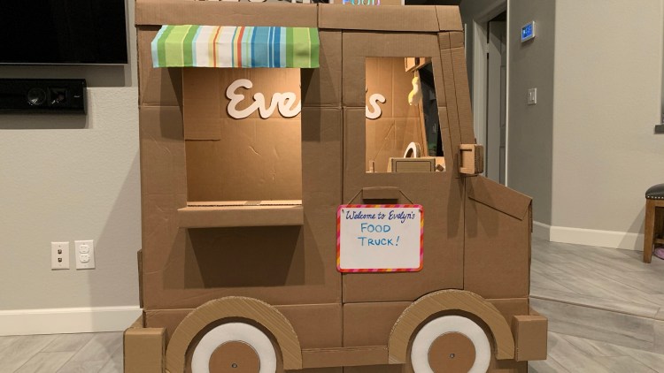 Over the course of staying at home in 2020 and spending a lot of time (and money lol) shopping online, my family found ourselves with an overwhelming collection of cardboard boxes. As such, I only did what any sensible person would do…create a make-believe food truck for my daughter to play in. It features a colorful light up sign, courtesy of left over Christmas lights, and comes with its very own cardboard register.