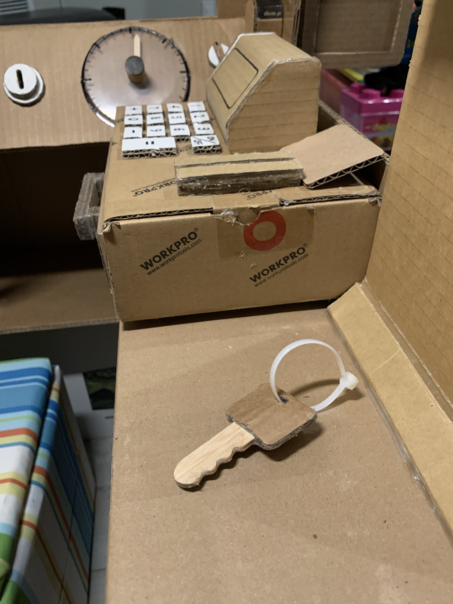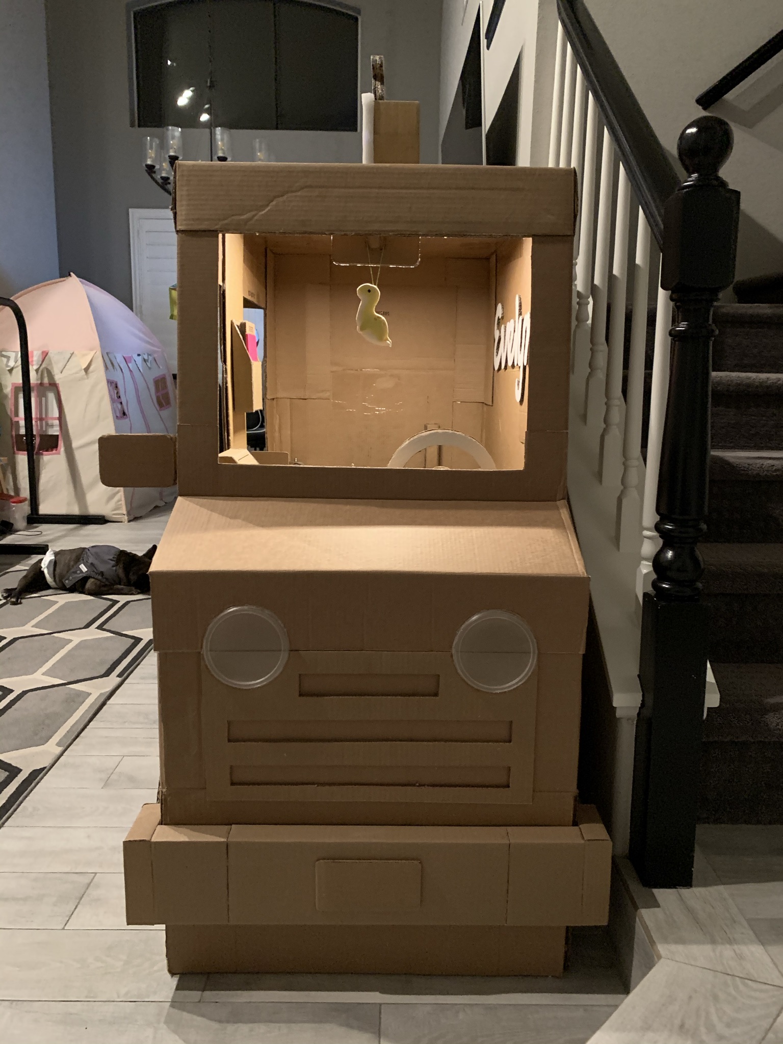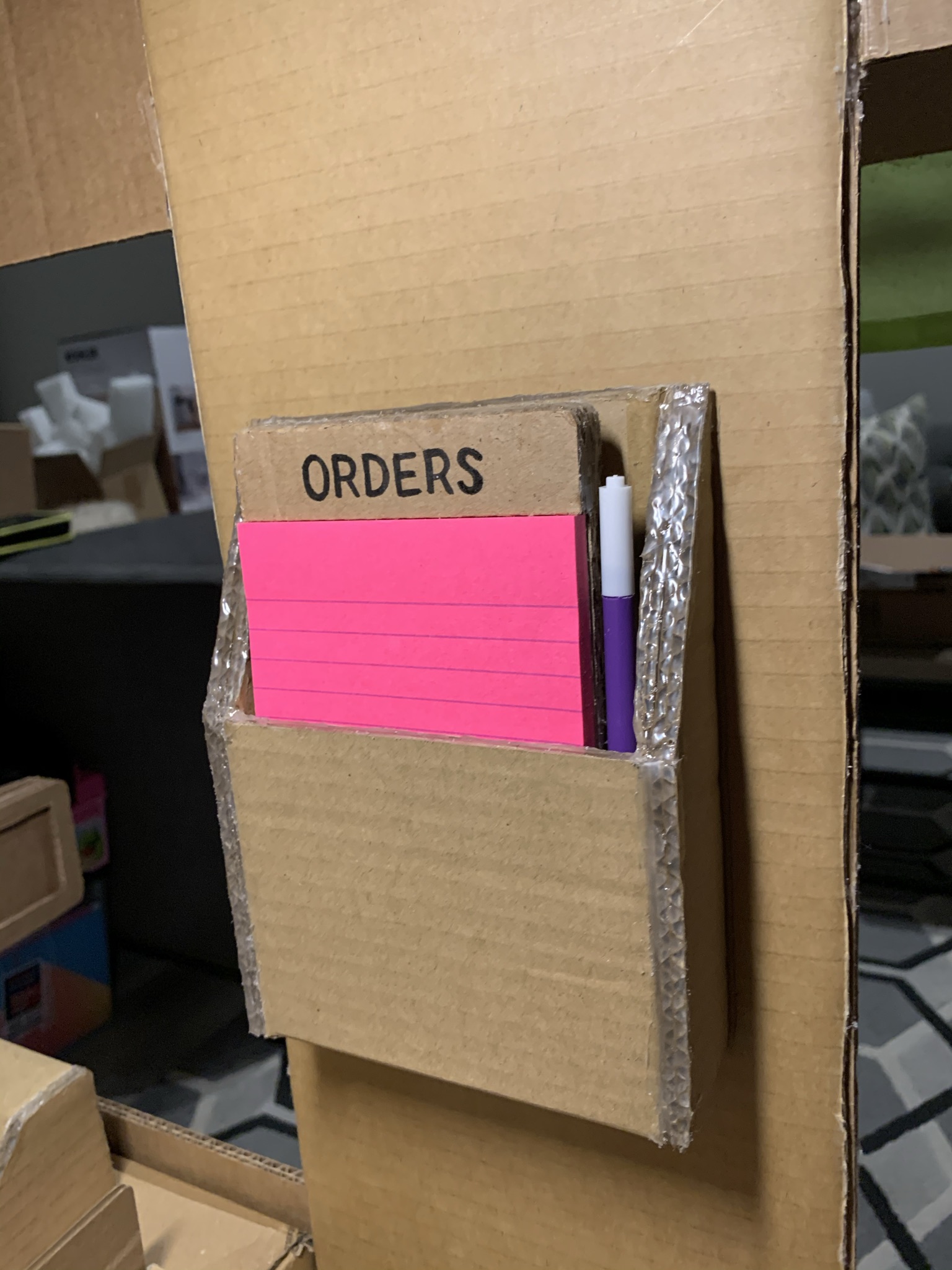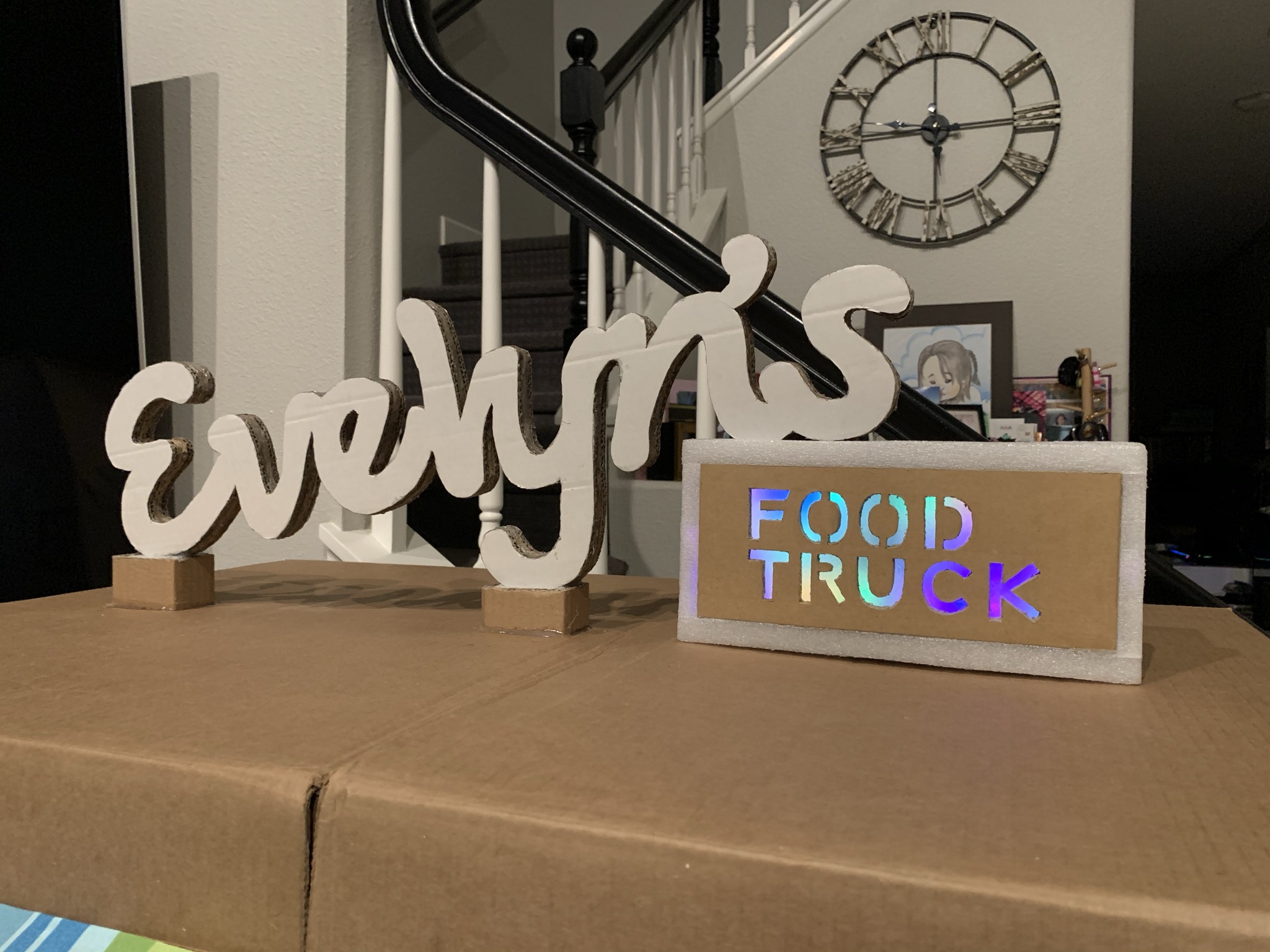 Over the course of staying at home in 2020 and spending a lot of time (and money lol) shopping online, my family found ourselves with an overwhelming collection of cardboard boxes. As such, I only did what any sensible person would do…create a make-believe food truck for my daughter to play in. It features a colorful light up sign, courtesy of left over Christmas lights, and comes with its very own cardboard register.